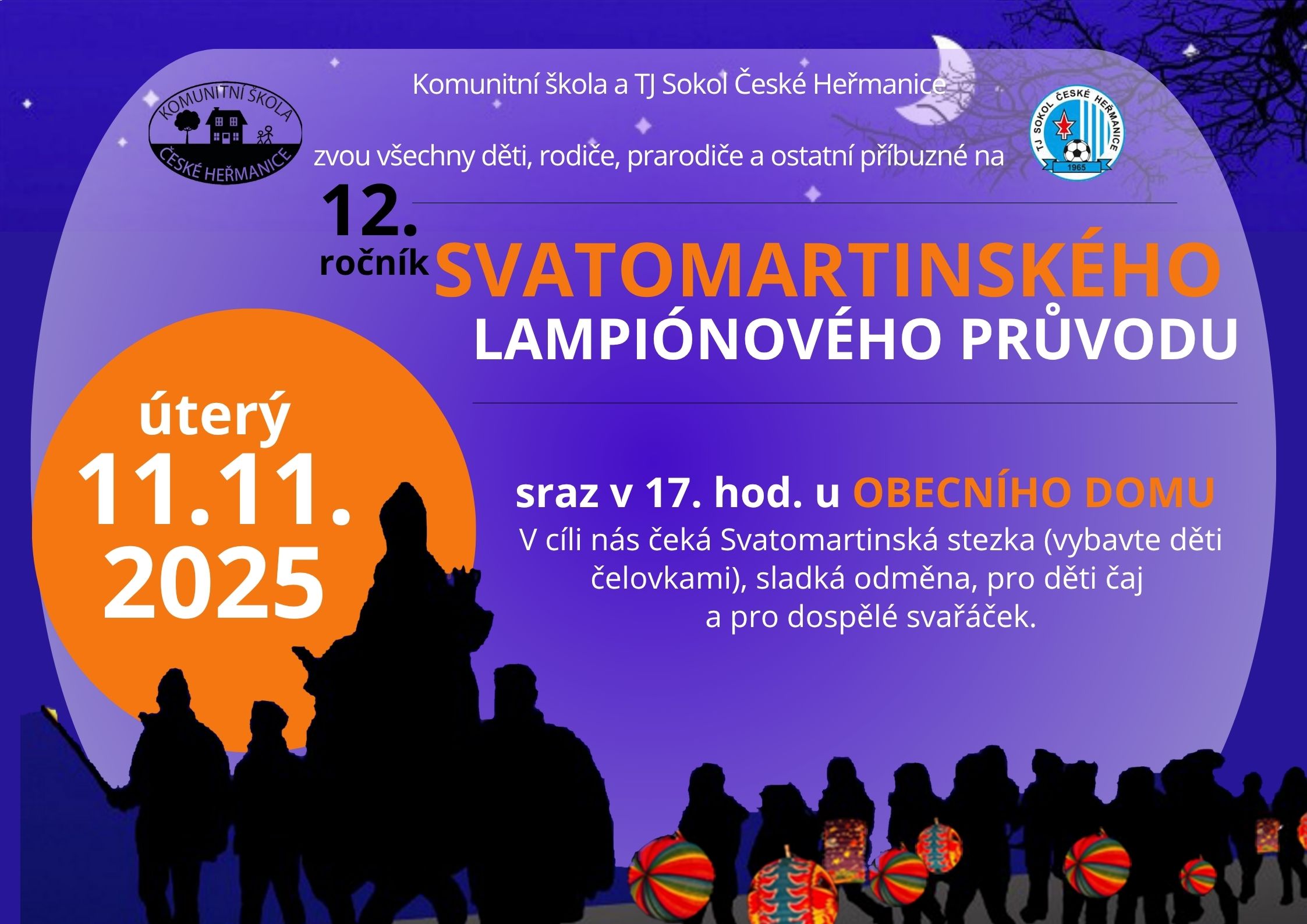 Komunitní škola a TJ Sokol České Heřmanice zvou všechny děti, rodiče, prarodiče a všechny přátelé na 12. ročník SVATOMARTINSKÉHO LAMPIÓNOVÉHO PRŮVODU.